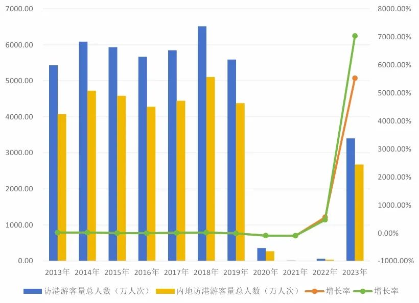Figure 1 Number, proportion and growth rate of mainland tourists visiting Hong Kong (2013-2023)
