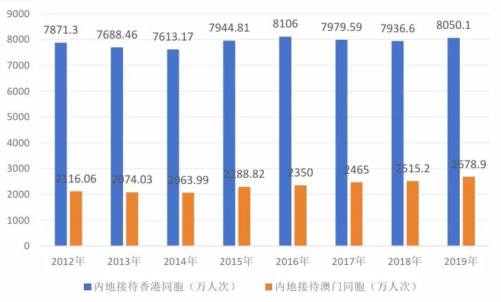 Figure 3 Number of tourists from Hong Kong and Macao received by the Mainland (2012-2019)