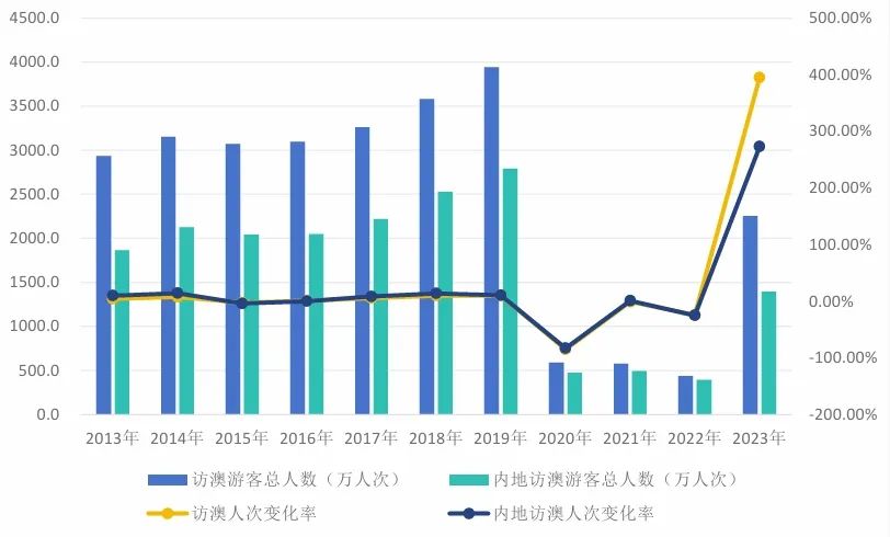 Figure 2 Number, proportion and growth rate of mainland tourists visiting Macao (2013-2023)