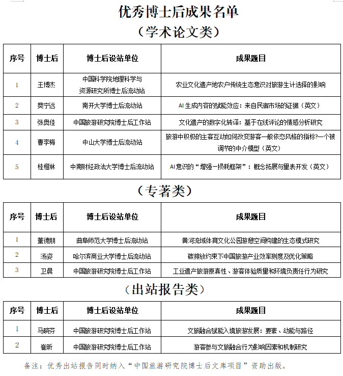 经个人申报、形式审查、通讯评审并会议审定,第八届全国旅游管理博士后学术交流活动共评出10项优秀成果,其中,学术论文5项,学术专著3项,出站报告2项。名单于12月23日在桂林发布,具体如下。