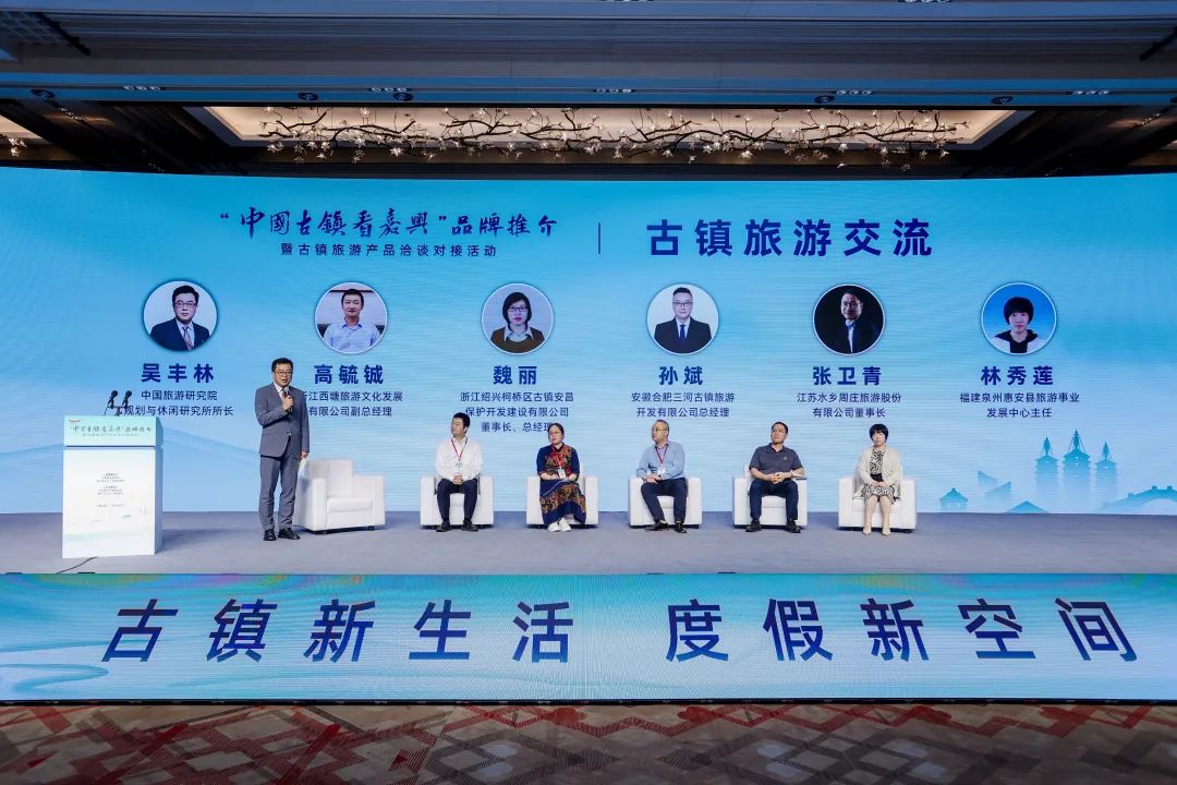 中国旅游研究院规划与休闲研究所所长吴丰林主持古镇旅游交流环节,并与江苏水乡周庄旅游股份有限公司董事长张卫青、安徽合肥三河古镇旅游开发有限公司总经理孙斌、福建泉州惠安县旅游事业发展中心主任林秀莲、浙江绍兴柯桥区古镇安昌?;た⒔ㄉ栌邢薰径鲁の豪觥⒄憬魈谅糜挝幕⒄褂邢薰靖弊芫砀哓诡褚煌乒耪蛞堤?、活化利用、创新举措等内容展开交流对话。