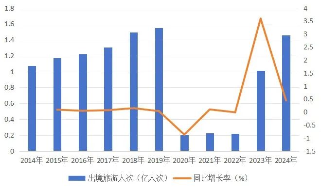 《报告》指出,2024年中国公民出境旅游市场达到 1.46亿人次, 接近 2019年水平。