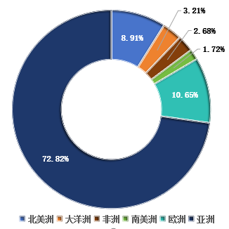 在洲际出境旅游目的地中,亚洲继续占据最大份额。其次为欧洲、北美洲、大洋洲、非洲和南美洲。