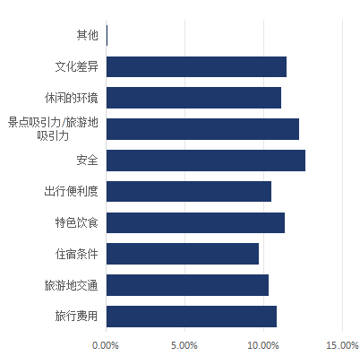结合大数据分析,中国旅游研究院对中国31个省、自治区和直辖市的游客进行出境旅游的需求和未来意愿开展了问卷调查。整体上来看,受访者更关注性价比、饮食和住宿条件,更期待新奇体验。偏好与朋友、家人结伴出游,安全和吸引力是影响出境游客选择旅游地的重要因素,景区参观游览为境外旅游最重要的项目,出境旅游最想参加娱乐性活动,迫切需要保障服务品质和降低旅行价格,更希望到访有特色美食和文物古迹的目的地。