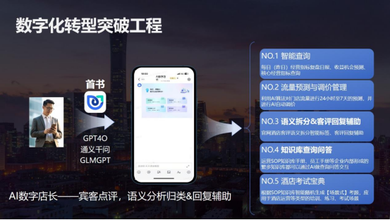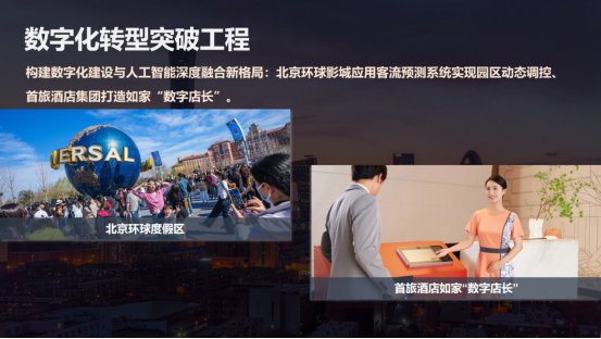 二是数字化转型突破工程。首旅集团持续构建数字化建设与人工智能深度融合的新格局,推进数字化生态平台项目,推动AI技术与企业经营管理相结合。集团旗下环球影城应用了客流预测系统,实现了园区动态调控,能够容纳单日最高游客5.5万人次,还能让游客有一个很好的体验。首旅酒店打造的“数字店长”项目通过接入人工智能大模型,建设了酒店运营的智能体,目前能够承担酒店门店60%的复杂性、基础性、重复性的工作。