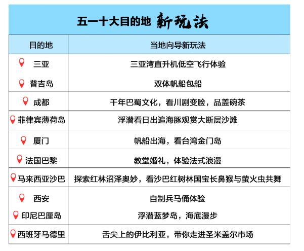 随着人们对旅游体验的重视加深,常规的景点观光游已不能完全满足游客个性化的需求。今年“五一”涌现出一批时尚新玩法,定制游、主题游、当地向导报名火爆。马蜂窝数据显示,“五一”期间,自由行游客最关注的十个关键词分别为:行程规划、自驾、景点、美食、酒店、交通、天气、行前准备、亲子游、海岛。其中,关于自驾游行程规划的提问最多,有关目的地美食、景点、交通等当地旅游消费的游记和讨论也受到游客广泛关注。从携程主题游数据来看,小长假期间最受欢迎的主题游类型是:奢旅生活、徒步登山、深度摄影、潜水和极地探索。体验英国皇室生活、品味唐顿庄园悠闲下午茶不再是电视剧中的桥段,通过丰富的旅游方式游客可以亲身体验并且尝试更多的新玩法。此外,旅游者可以通过普吉岛的“洋向导”体验双体帆船包船出海,去马来西亚潜入沙巴红树林探索长鼻猴和萤火虫共舞,甚至在西安亲自制做兵马俑。