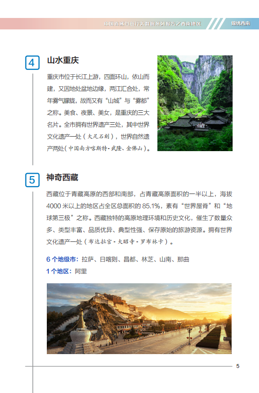该报告以双方旅游大数据为基础,深度剖析了中国西南地区五省区市——云南、贵州、四川、重庆、西藏的旅游市场现状与未来发展趋势。报告显示,西南五省区市的旅游热度近年有大幅增长,自驾、古镇、美食成为西南地区最受旅行者关注的关键词。报告全文如下: