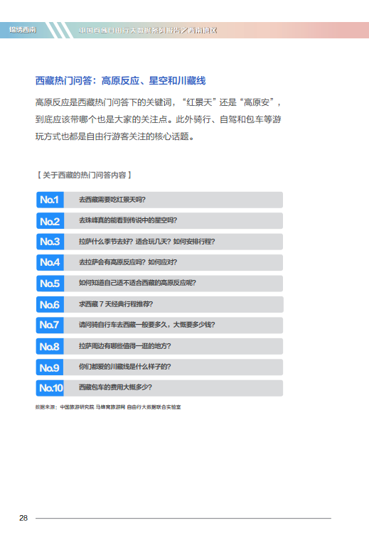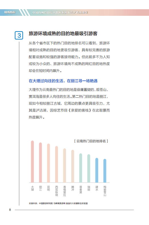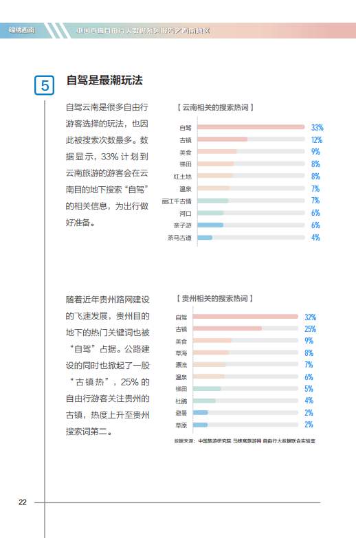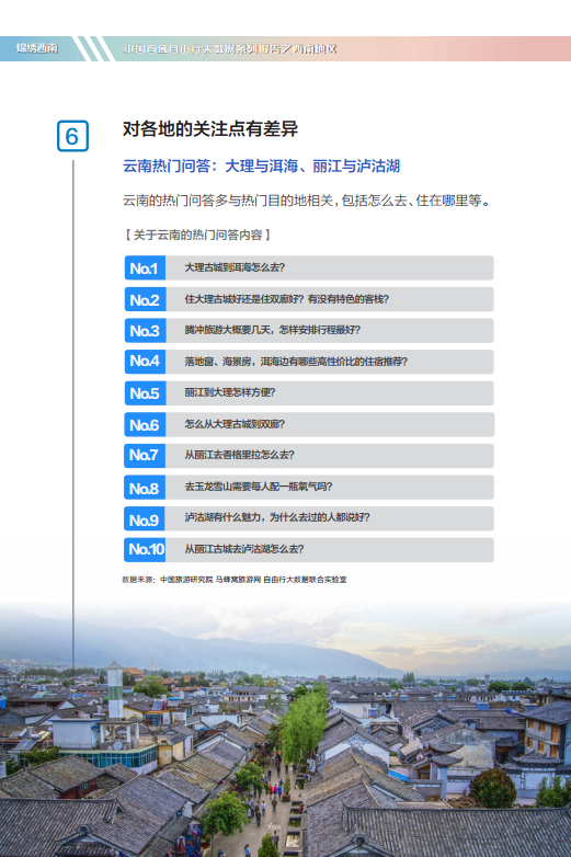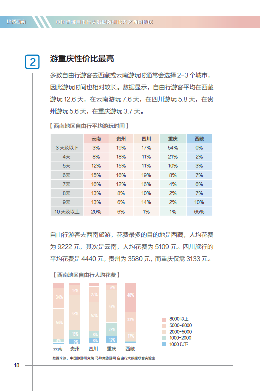 中国旅游研究院戴斌院长指出:随着消费经验的成熟,特别是智慧旅行的普及,自主化决策、自助旅游、自由行已经成为当前和今后一个时期旅游市场的基本特征。2018年5月24日,中国旅游研究院与马蜂窝旅游网联合成立的“自由行大数据联合实验室”发布了《锦绣西南——中国省域自由行大数据系列报告之西南地区》。