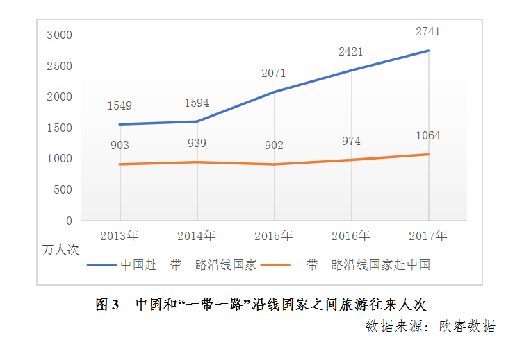 “一带一路”沿线国家赴中国旅游游客保持稳定增长,由2013年的903万人次,发展为2017年的1064万人次。中国出境到“一带一路”沿线国家的游客人次逐年攀升,由2013年的1549万人次,增长到2017年的2741万人次,五年间增长了77%,年均增速达15.34%。特别是随着2015年“一带一路”相关合作政策不断推向深入,中国赴“一带一路”沿线国家游客人次增长提速,中国之于“ 一带一路”国家旅游经济发展的基石地位不断凸显。