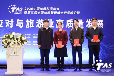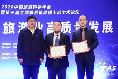 在2020中国旅游科学年会优秀论文颁奖环节,李仲广副院长宣读了一等奖、二等奖和三等奖获奖论文名单,戴斌院长为在京论文作者孙逸、耿波颁奖。